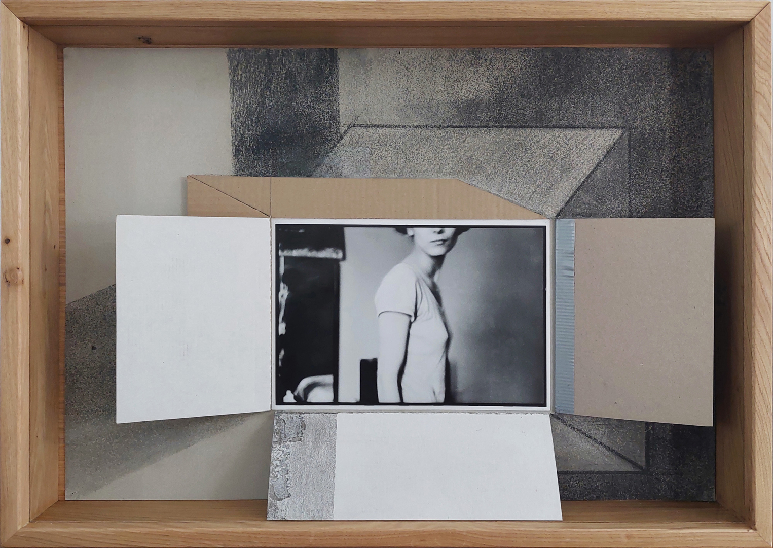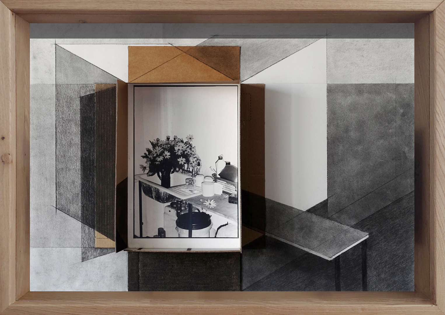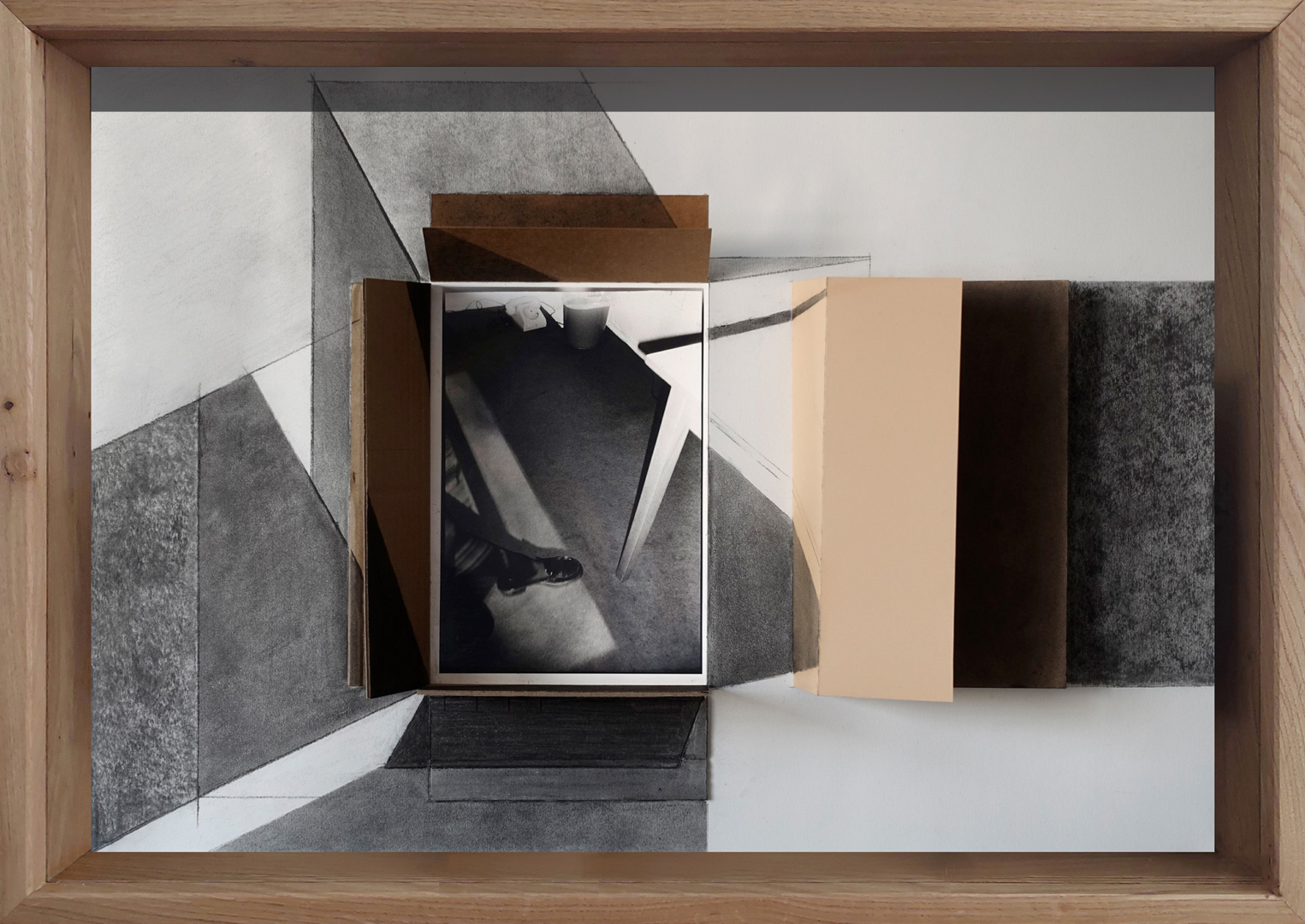 Another element I notice when looking back at the series’ development is its connection to previous projects, some dating back to my student years, when I worked with photography, drawing, and cardboard boxes for objects and installations, some even featuring movable cardboard flaps. In these early works, I find an interest in combining photography with other media or the possibility of reconfiguring a work over time, visual instruments that I further explored in Viewfinder.
