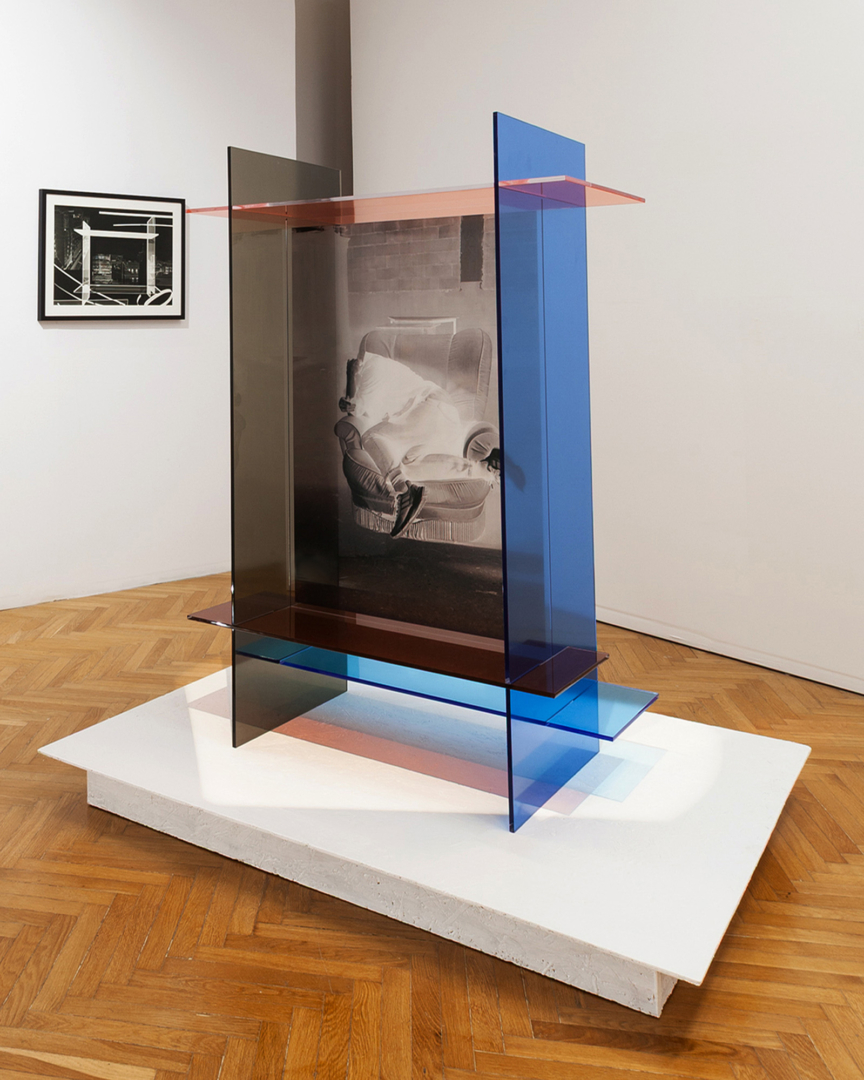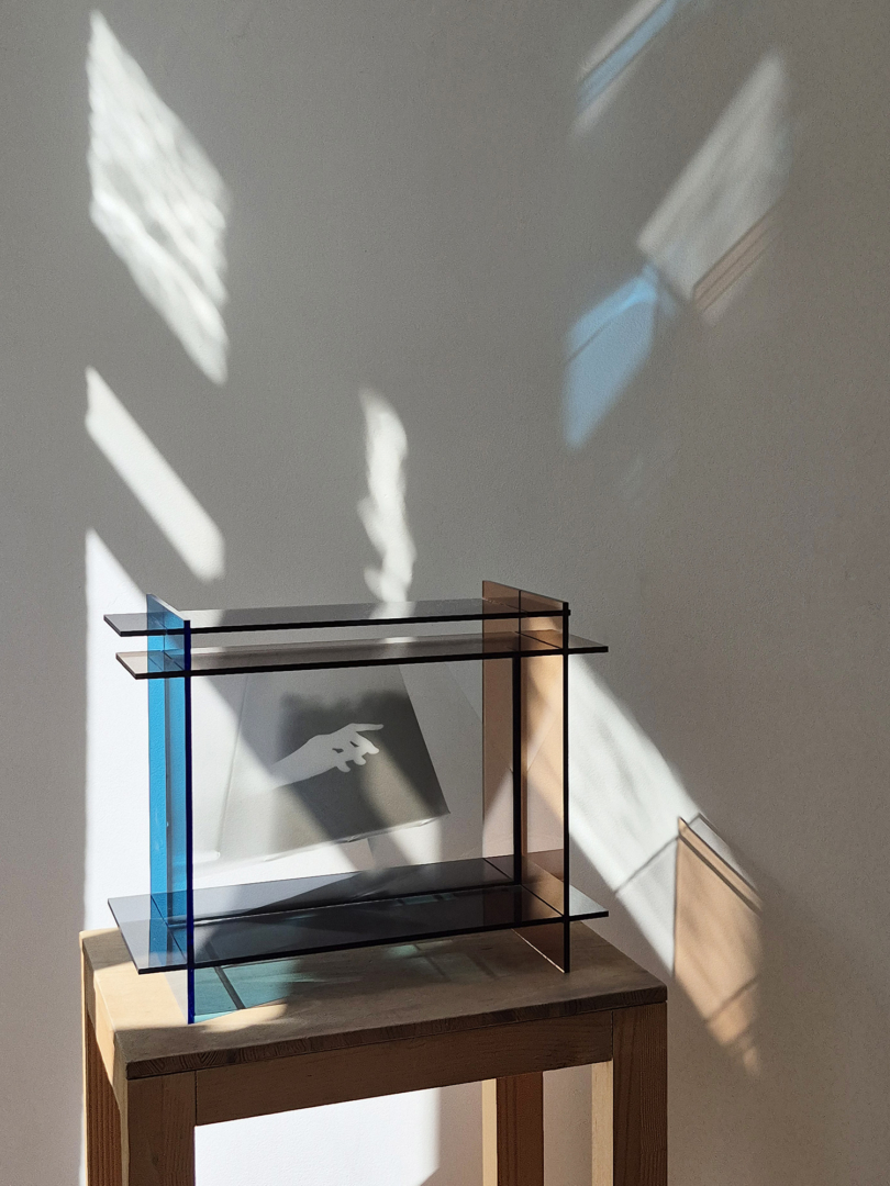 One of the recent works, Viewfinder-Clash (Self-Portrait After a Fall), 2025, is a sculptural piece that transforms the mock-ups from earlier stages into a large, autonomous object. The use of transparent colored acrylic sheets and a photographic negative at the center of this large structure continues the observation of the beginnings of cameras as physical devices, as well as how these mechanisms produced images.